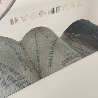 Der intime Protest Quilt von Johanna Müller beschäftigt sich mit den problematischen Verschärfungen innerhalb der französischen Migrationspolitik. Eingewebt in den Fasern ihres Patchwork-Quilts sind ihre persönlichen Erfahrungen – sie und ihr Partner waren gezwungen, ihre eigene Beziehung vor der Politik zu rechtfertigen, um eine Ausweisung zu umgehen. So betrachten wir auf den verschiedenen Quadraten des Textils verblasste Fotografien, lesen Auszüge aus privaten Chatverläufen und erfahren emotionale Momente und Gedanken. Erweitert wird diese Ebene durch den am Boden angebrachten Spiegel, der die unsichtbaren Texte der bestickten Unterseite des Stoffes offenbart.
